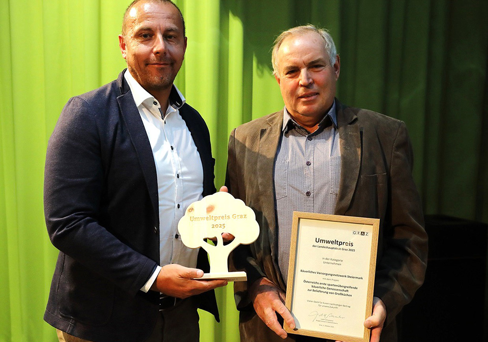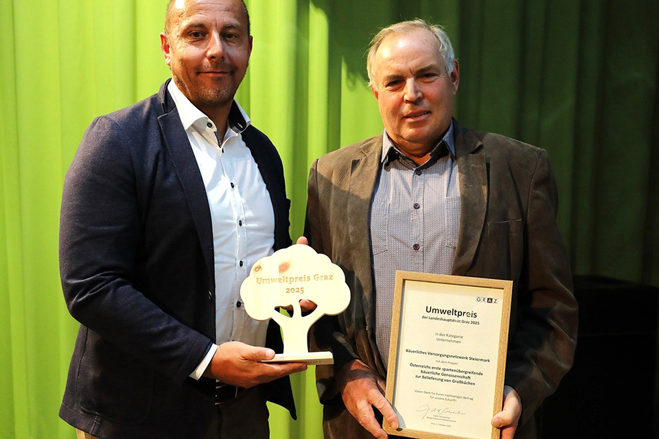 Unter dem Motto „Wir essen klimafreundlich!" stand der Umweltpreis der Stadt Graz im Jahr 2025, der im Oktober im Rahmen des "Marktes der Zukunft" verliehen wurde. Der erste Platz ging an die Genossenschaft Bäuerliches Versorgungsnetzwerk Steiermark.