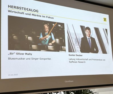 Nach dem Interview und den musikalischen Darbietungen von Sir Oliver Mally betrat ein international anerkannter Experte die Bühne: Gunter Deuber, der Chefanalyst der Raiffeisen Bank International und Leiter von Raiffeisen Research. Deuber gab einen nüchternen, realistischen Ausblick auf die wirtschaftlichen Rahmenbedingungen und das globale Marktumfeld - die Wirtschaft in "Blues-Laune" quasi.