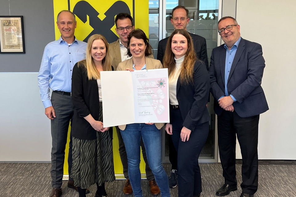 Für ihre nachhaltigen Finanzprodukte mit dem Österreichischen Umweltzeichen ausgezeichnet wurde die Raiffeisen-Landesbank (RLB) Steiermark. Im Rahmen der feierlichen Verleihung überreichte Umweltminister Totschnig die Auszeichnung an die Leiterin des Nachhaltigkeitsmanagements in der RLB, Sophie Koppensteiner, die sich bei ihrem ganzen Projektteam für die gemeinsamen erfolgreichen Anstrengungen bedankte.