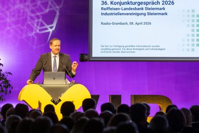 Gastgeber RLB-Steiermark-Generaldirektor Martin Schaller begrüßte zahlreiche Gäste am 8. April in der RLB-Zentrale in Raaba-Grambach und betonte in seiner Rede, dass die wirtschaftlichen und geopolitischen Verschiebungen viele Unternehmerinnen und Unternehmer vor große Herausforderungen stellen. „Wir erleben tektonische Verschiebungen in Wirtschaft, Gesellschaft und Weltpolitik. Das spüren vor allem auch heimische Unternehmen: Entscheidungen werden schwieriger, Unsicherheiten größer und der Druck auf viele Betriebe steigt. Gerade in solchen Phasen braucht es Orientierung, praktikable Rahmenbedingungen und Partner, die Handlungsfähigkeit stärken. Denn Abschottung schafft keine Sicherheit. Raiffeisen versteht sich als stabiler Anker und verlässlicher Begleiter der Wirtschaft“, so Schaller.