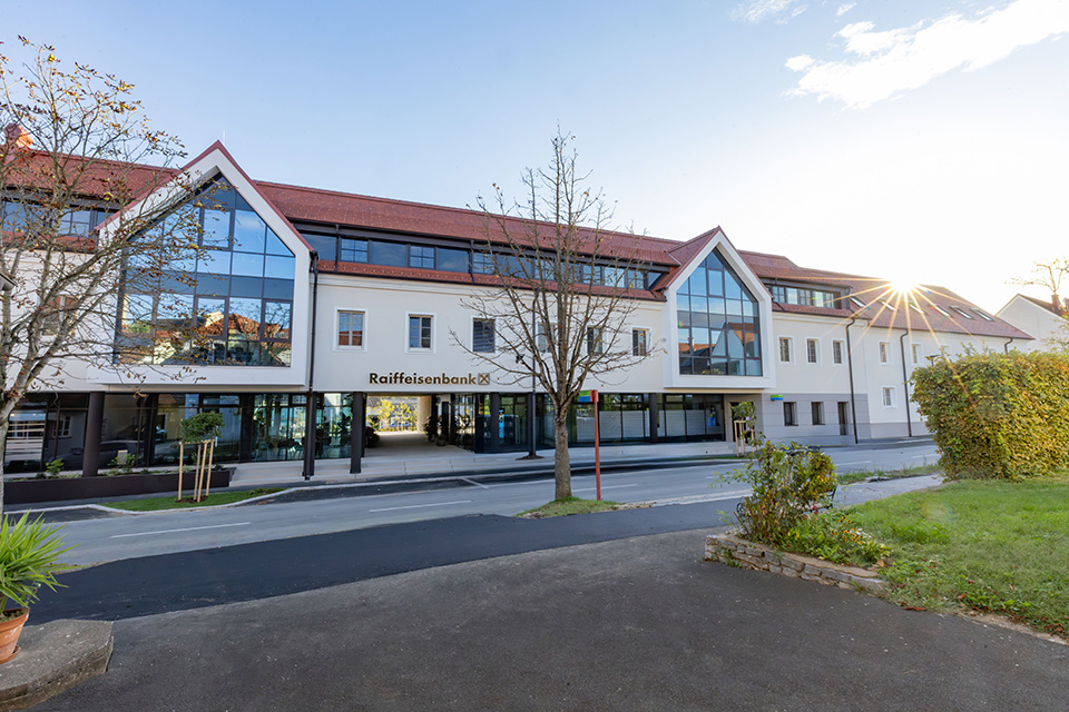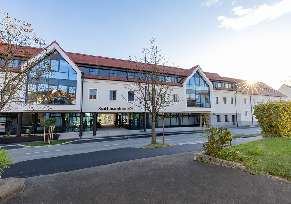 Mit dem Neubau am „Unteren Marktplatz“ in Ilz, an dem über 60 regionale Betriebe beteiligt waren, hat die Raiffeisenbank Ilz-Großsteinbach-Riegersburg ein modernes Haus geschaffen, das die genossenschaftliche Idee sichtbar macht: für die Menschen, für die Region und für die Zukunft. Auf 1.800 Quadratmetern Nutzfläche bietet das Gebäude großzügigen Raum für über 40 Mitarbeiter:innen. Besonders innovativ: moderne Team-Büros, die durch ihre Aufteilung wie Einzelbüros wirken und so konzentriertes Arbeiten ermöglichen – verbunden mit kurzen Wegen für Austausch und Zusammenarbeit. Für die Beratung der Kund:innen stehen buchbare Besprechungsräume mit modernster Ausstattung zur Verfügung. Der Empfangsbereich mit Diskretkassen und einem Empfangspult auf Fünf-Sterne-Hotel-Niveau garantiert höchste Diskretion und Professionalität schon beim Betreten des Hauses.