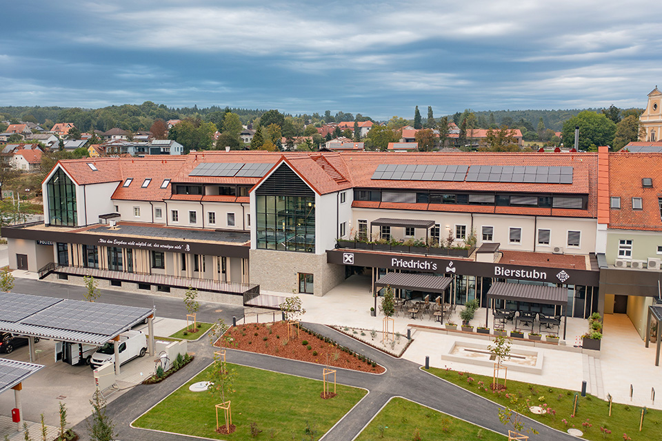 Ein besonderes Highlight ist der Sozialraum am schönsten Platz des Gebäudes: ein Ort, an dem sich Mitarbeiter:innen treffen, austauschen und Kraft tanken können. Damit setzt die Bank ein klares Zeichen, wie wichtig das Miteinander im täglichen Arbeiten ist. Im Erdgeschoss wurde zudem ein multifunktionaler Veranstaltungssaal geschaffen – flexibel nutzbar für Seminare, Kundenveranstaltungen oder interne Meetings. Ergänzt wird das Angebot durch das Büro von Raiffeisen Immobilien, das Café Friedrich, die Bierstube sowie den Polizeiposten.