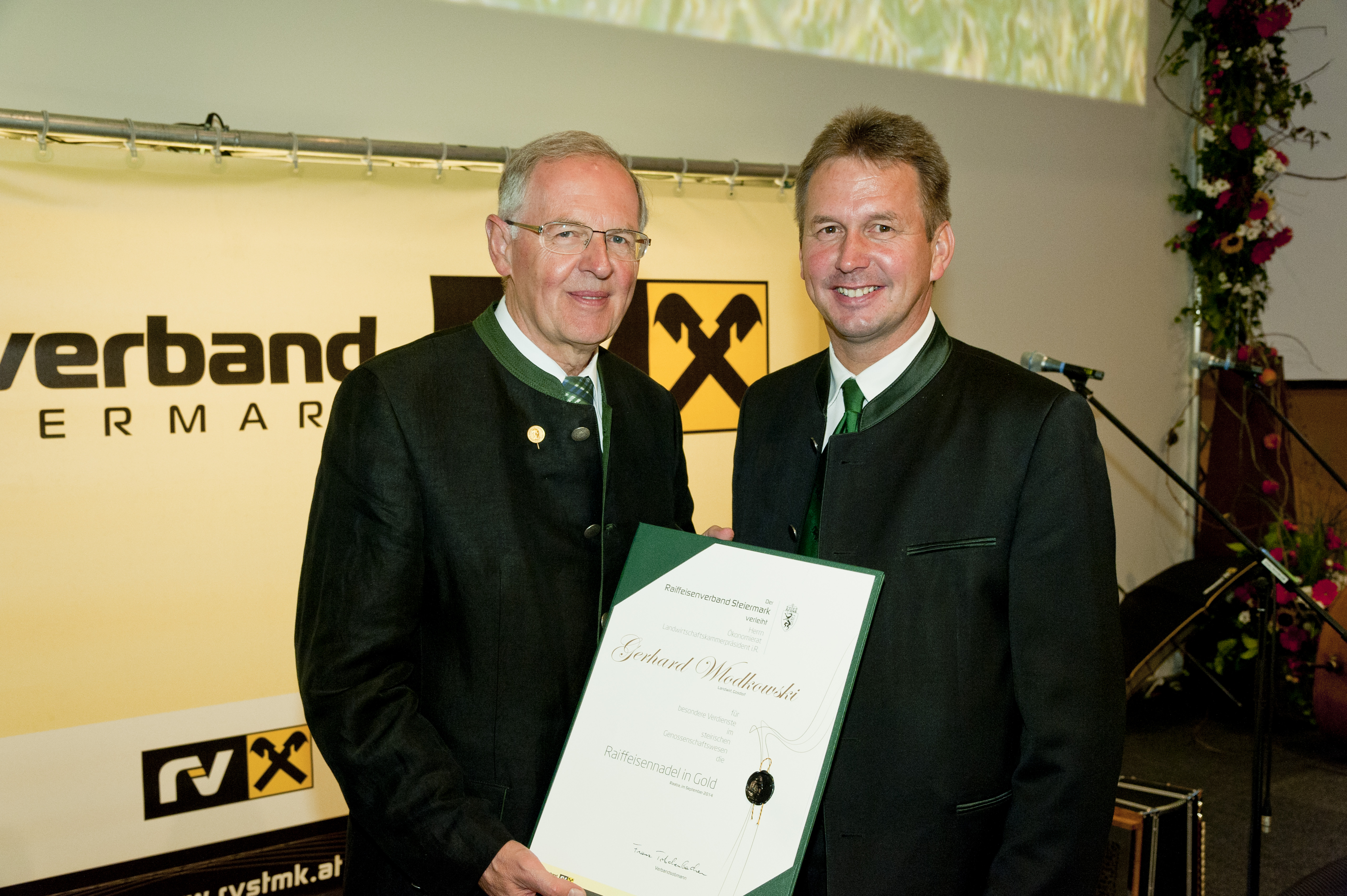 Landwirtschaftskammer-Präsident Gerhard Wlodkowski (li.) erhält von Verbandsobmann Franz Titschenbacher der Raiffeisennadel in Gold verliehen.