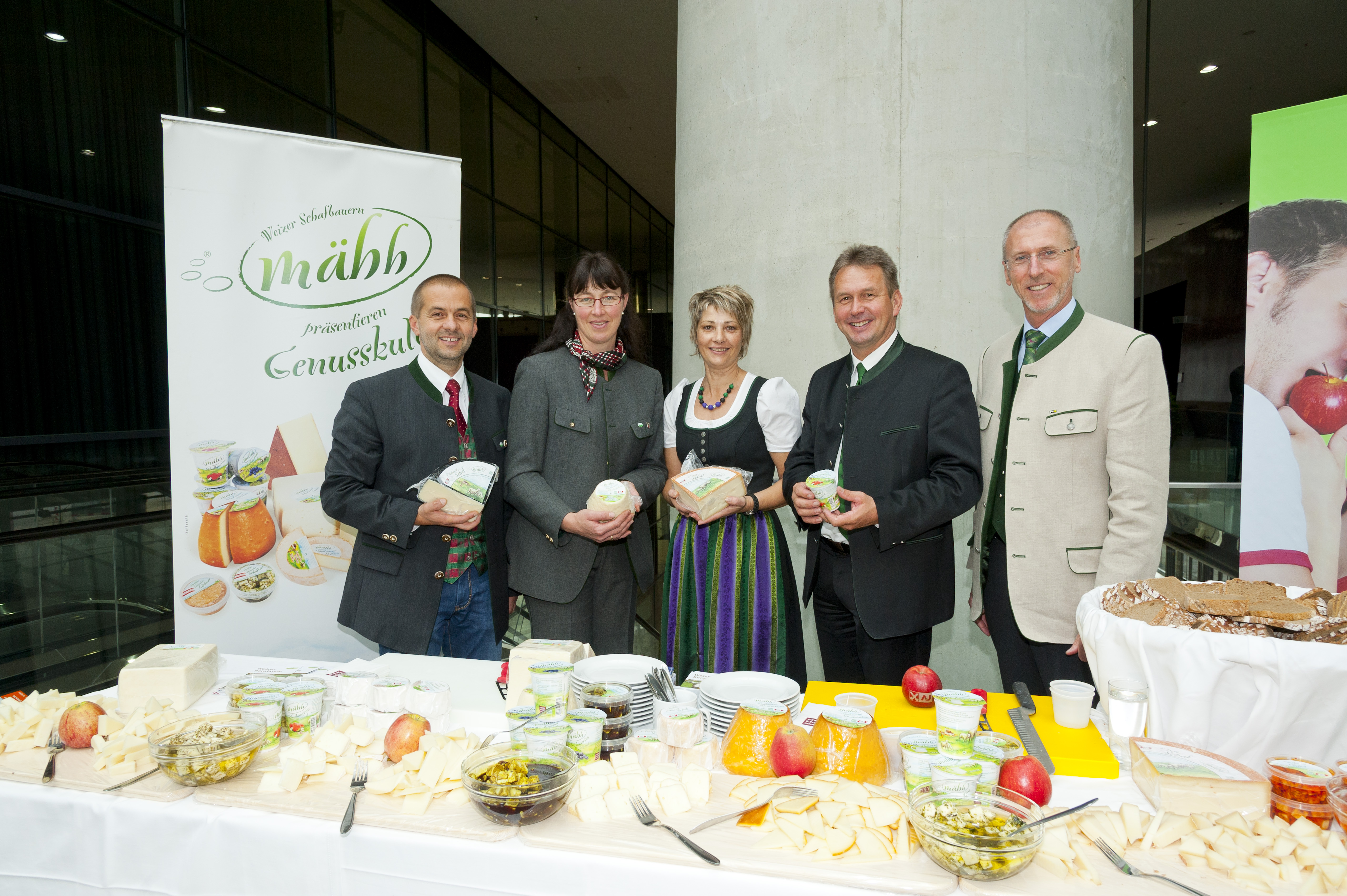 Die Weizer Schafbauern präsentieren ihre Köstlichkeiten Verbandsobmann Franz Titschenbacher (2. v. re.) und Verbandsdirektor Heinrich Herunter (re.).