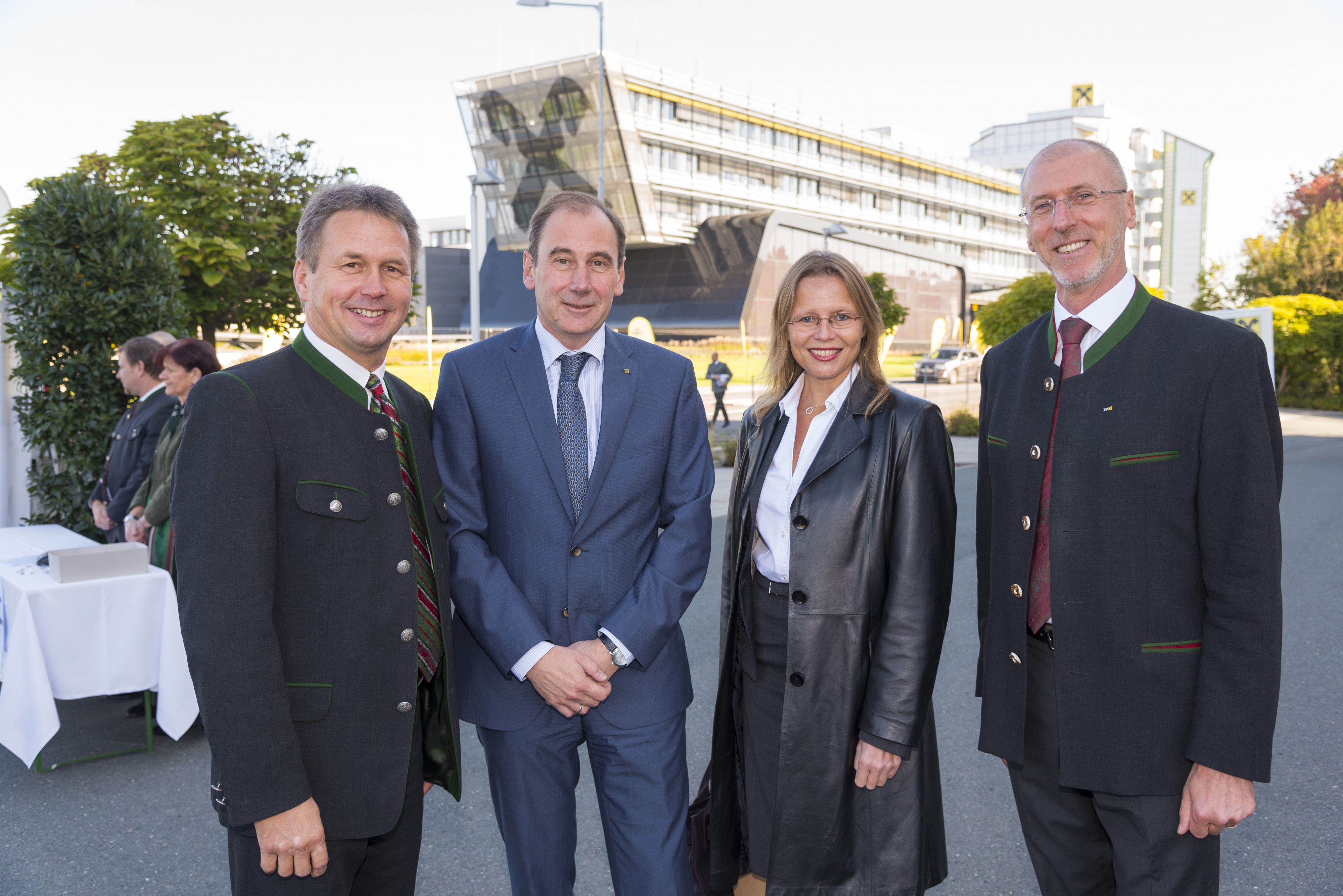 Verbandsobmann Franz Titschenbacher, RLB-Generaldirektor Martin Schaller, Nationalratsabgeordnete Beatrix Karl und Verbandsdirektor Heinrich Herunter (v. li.) beim Empfang am Verbandsgelände in Raaba