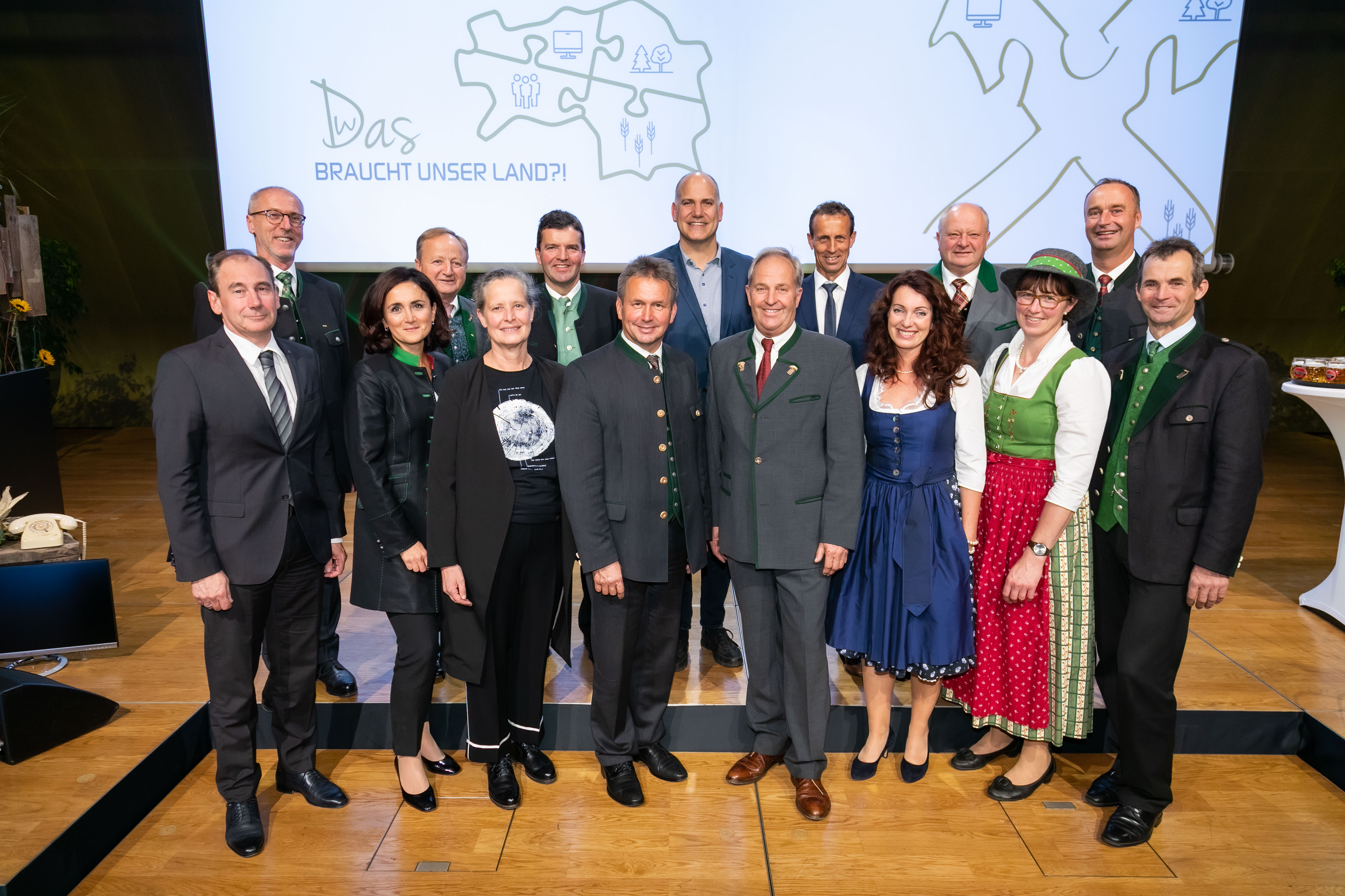 Moderatorin Barbara Schiefer, Regionalentwicklungsexperte Gerald Mathis, Verbandsobmann Franz Titschenbacher, EU-Mandatarin Simone Schmiedtbauer, Genossenschaftsstratege Justus Reichl, Landjugend-Führungsmitglied Katharina Muhr, Verbandsdirektor Heinrich Herunter (v. li.)