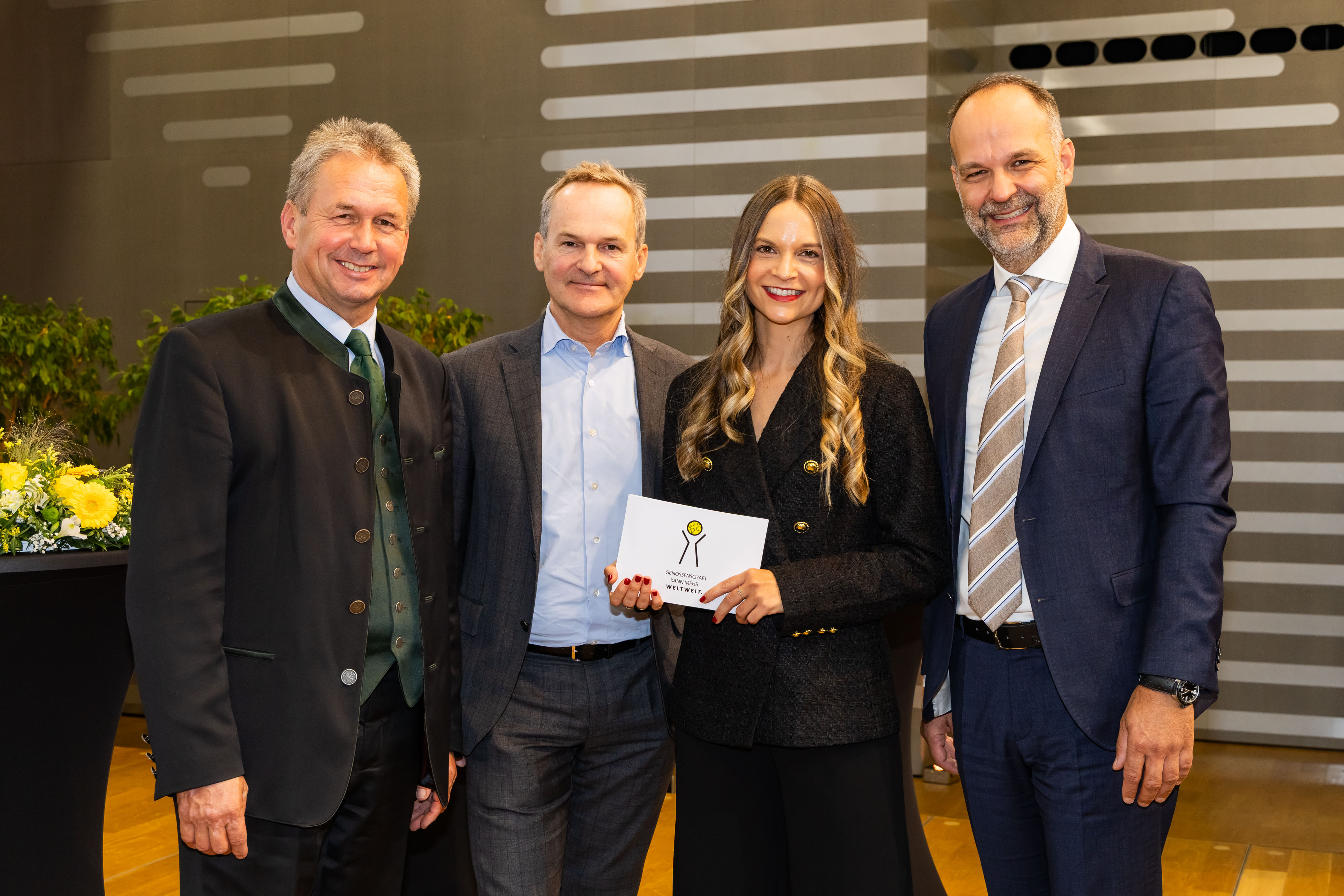 Verbandsobmann Franz Titschenbacher, Gastreferent Franz Schellhorn, Moderatorin Verena Kicker, Verbandsdirektor Peter Weissl (v. li.)